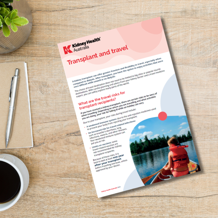 This factsheet is for people who have had a kidney transplant and their families and friends looking to learn more about safe travel after transplant. Print out the “Travel health information form” found in this factsheet to help you prepare for your next holiday.